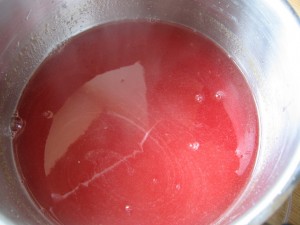 Dupa care se ia de pe foc si daca se doreste se adauga colorantul. Merge lasat si fara pentru ca va avea culoarea sucului pe care l-ati folosit. Eu am adaugat 2 picaturi de colorant rosu.