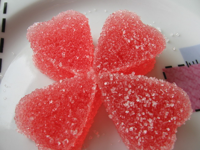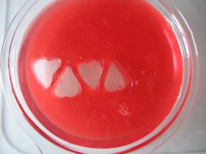 Dupa ce s-a temperat se introduce in frigider timp de 2 ore. Cand s-au scurs cele 2 ore fluidul trebuie sa se fi solidificat. Se scot jeleurile din forme sau din masa rezultata in vas decupati forme (eu am decupat inimioare)…