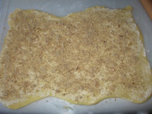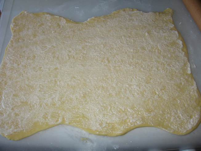 Aluatul dupa ce a crescut se imparte in 2 si din bucatile rezultate se intinde cate o foaie de aproximativ 1 cm grosime.