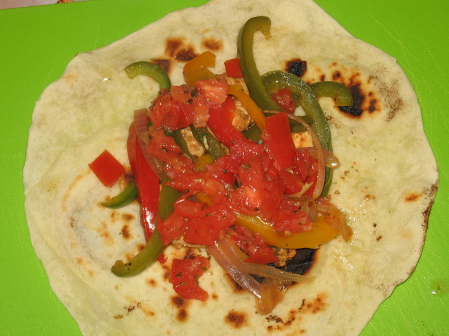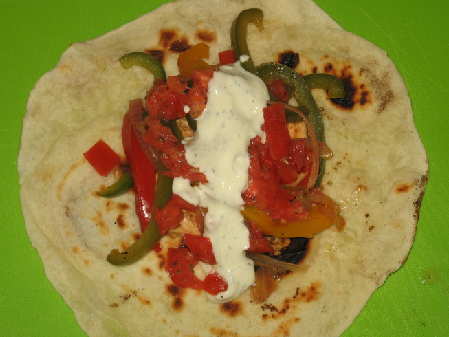 Si acum trecem la ansamblat de fajitas. Tortillas trebuie sa fie calde, daca le aveti din zilele anterioare atunci le incalziti cateva scunde in microunde sau un cuptor. Se ia o tortilla si si in mijlocul ei se adauga fasiile de pui, ardeiul gras si ceapa calite…