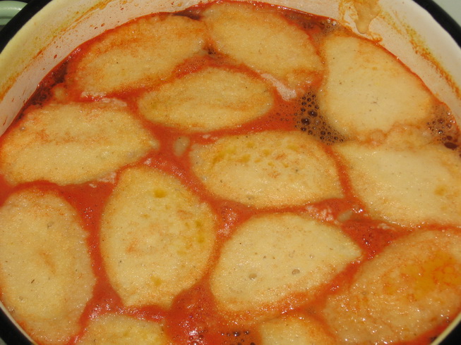 Cu ajutorul unei lingurite inmuiate in supa se ia aluat de gris si se elibereaza in supa de rosii. Se procedeaza la fel cu tot aluatul, avand grija ca dupa fiecare galusca adaugata sa se inmoaie lingurita in supa. Veti observa ca ele vor incepe sa se umfle. Se fierb timp de 20 min.