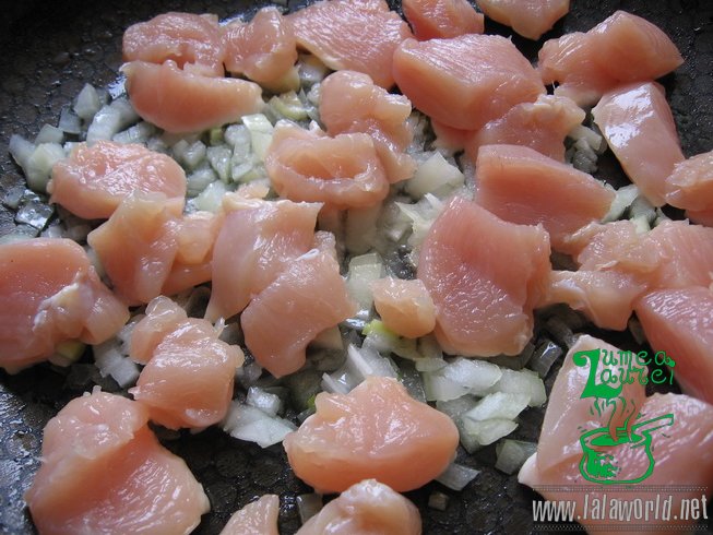 Pieptul de pui se taie in bucatele mici si se adauga intr-o tigaie, in care am incins 2 linguri de ulei, impreuna cu ceapa tocata marunt.